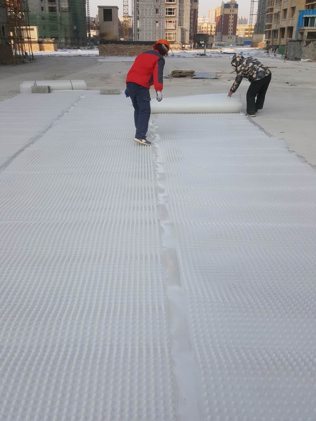 通州區(qū)客戶定制白色全新料排水板 型號是2公分 抗壓強度很高 質(zhì)量好 人上去一點沒問題 此材料是全新料生產(chǎn)的 它比普通國產(chǎn)的質(zhì)量好很多 色澤鮮亮 光滑 下面是工人們在現(xiàn)場施工圖 操作簡單 ,公司的施工技術(shù)人員劉師傅親臨現(xiàn)場指導(dǎo)